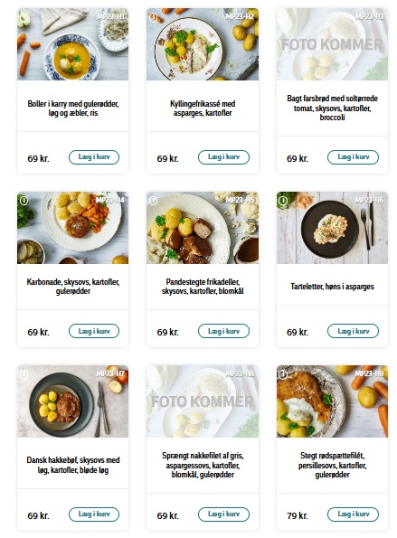 Herefter bliver du præsenteret for ugens menu. Her kan du frit tilføje så mange af den ene eller anden ret, som du måtte ønske. Du kan altså skræddersy måltidskassen til dine eller familiens smagspræferencer, så alle får lige præcis den mad, de har lyst til.